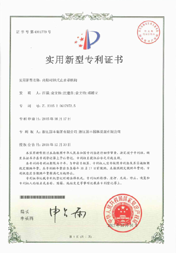 2016年3月,浙江國豐集團(tuán)有限公司和浙江國豐園林景觀有限公司取得“內(nèi)貼可卸式止水帶機(jī)構(gòu)”的實用新型專利證書。