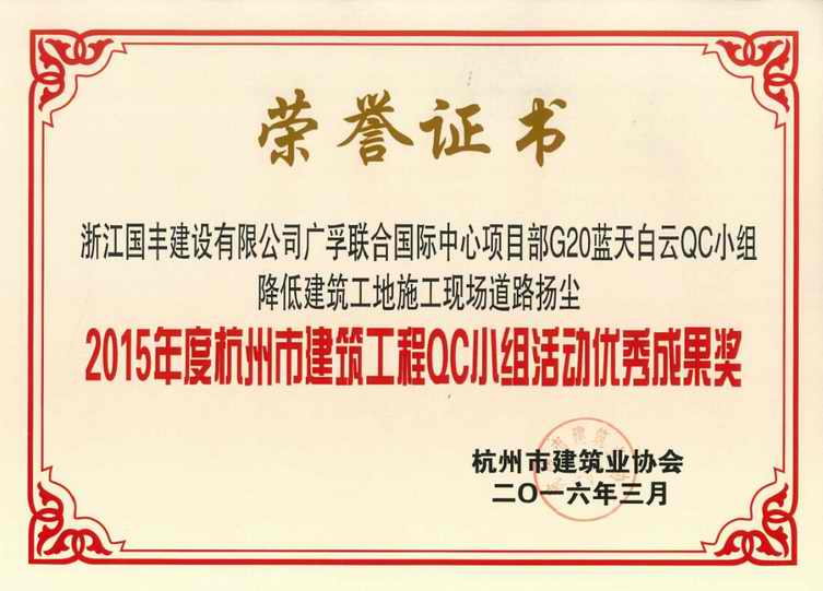 2016年3月,浙江國豐建設(shè)有限公司廣孚聯(lián)合國際中心項目部G20藍(lán)天白云QC小組“降低建筑工地施工現(xiàn)場道路揚(yáng)塵”榮獲2015年度杭州市建筑工程QC小組活動優(yōu)秀成果獎。