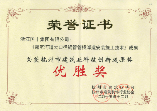 2015年12月28日,浙江國豐集團有限公司“超寬河道大口徑鋼管管橋浮運安裝施工技術”榮獲杭州市建筑業(yè)科技創(chuàng)新成果優(yōu)勝獎。