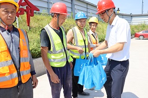 集團(tuán)領(lǐng)導(dǎo)班子成員組成四個(gè)慰問小組,分別帶隊(duì)深入項(xiàng)目部現(xiàn)場,詳細(xì)詢問一線員工的工作生活情況,對他們不畏酷暑、盡職盡責(zé)的辛勤工作和敬業(yè)精神表示感謝,并為他們送上防暑清涼用品,叮囑大家在高溫環(huán)境下要時(shí)刻注意防暑降溫,做好自我防護(hù)。