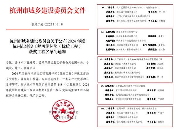 近日,杭州市城鄉(xiāng)建設(shè)委員會(huì)公布了2024年度杭州市建設(shè)工程西湖杯獎(jiǎng)(優(yōu)質(zhì)工程)獲獎(jiǎng)工程名單,我集團(tuán)承建的之江度假區(qū)單元XH1705-A4-21地塊體育中心、蕭山民營(yíng)經(jīng)濟(jì)發(fā)展中心、北干街道山口單元B-06地塊建設(shè)公共租賃用房工程、義橋鎮(zhèn)山后村城中村改造安置房、杭州市第二水源輸水通道工程江南線(xiàn)配水站5項(xiàng)工程榮獲嘉獎(jiǎng)。