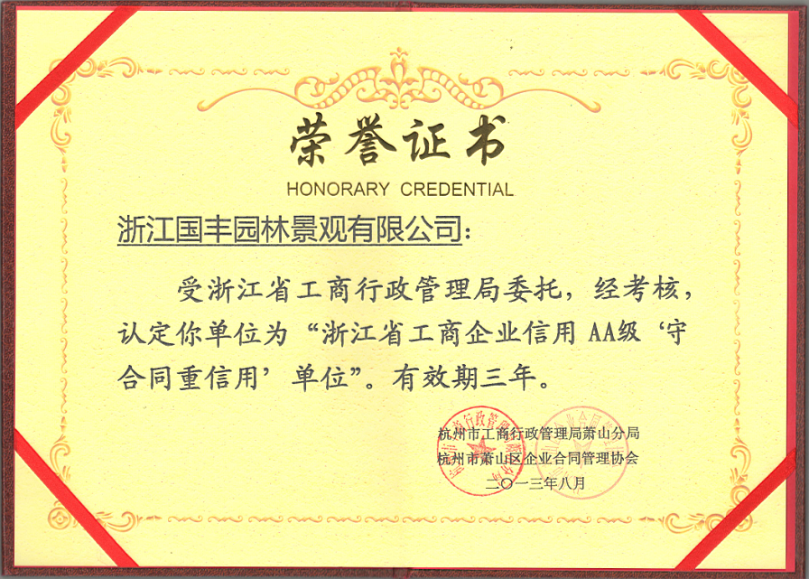 近日,我集團(tuán)下屬子公司“浙江國豐園林景觀有限公司”和“浙江國豐建設(shè)有限公司”通過了杭州市工商行政管理局的考核,獲得了“浙江省工商企業(yè)AA級‘守合同重信用’單位”的榮譽(yù)稱號。