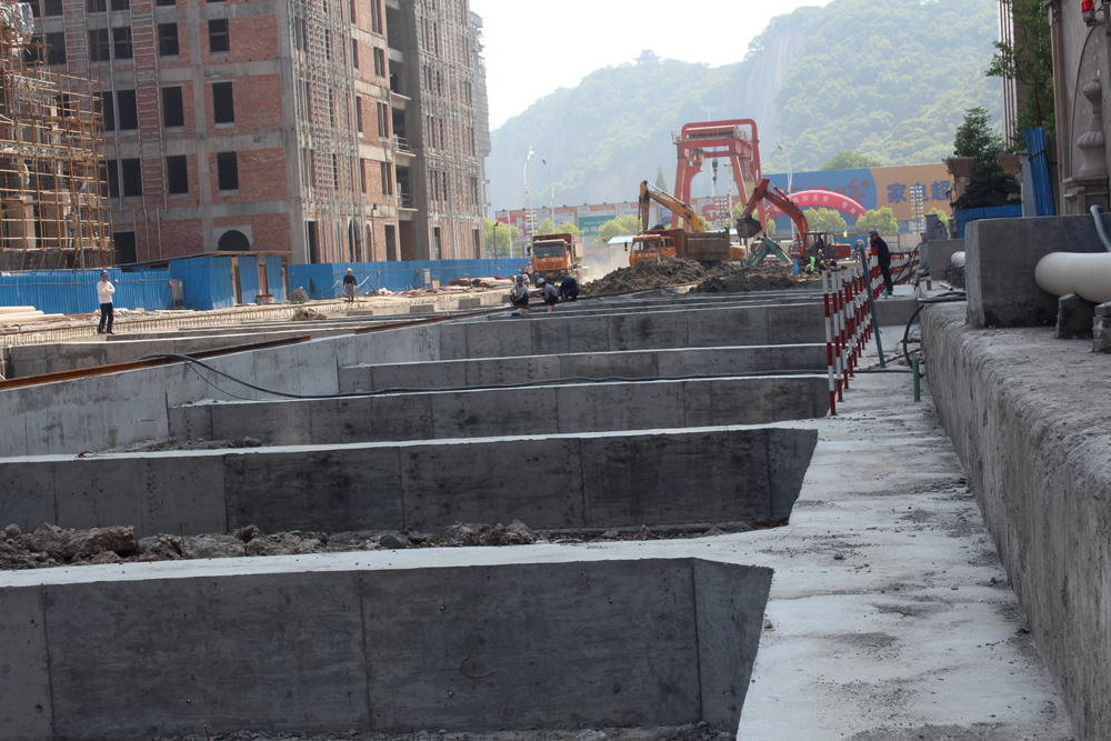 自2012年8月開工以來,圍護結(jié)構(gòu)施工已完成地下連續(xù)墻、立柱樁、坑內(nèi)地基加固、北側(cè)棧橋施工,南半側(cè)支撐梁已完成50%左右。鑒于之前充分的準(zhǔn)備和鋪墊工作,目前已順利進入基坑開挖階段施工。