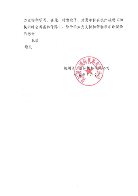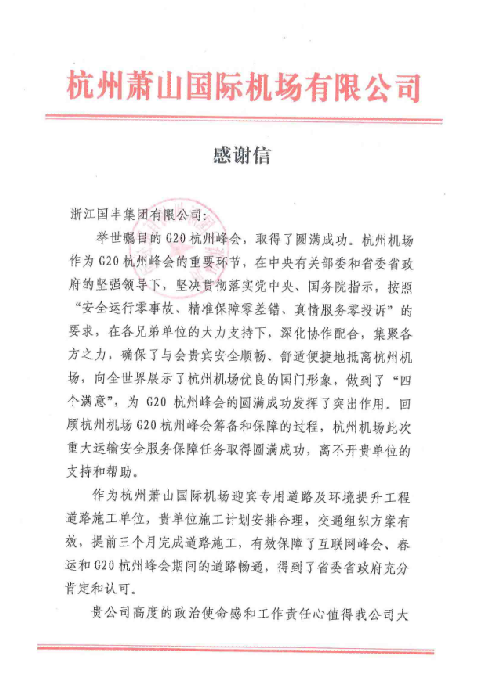 近日,我公司收到了杭州蕭山國際機(jī)場有限公司送來的感謝信。信中高度贊揚(yáng)了我公司在杭州蕭山國際機(jī)場迎賓專用道路及環(huán)境提升工程道路工程項(xiàng)目施工過程中合理安排施工計(jì)劃,科學(xué)編制交通組織方案,提前三個月完成道路施工,保障了G20峰會與會貴賓安全順暢、舒適便捷地抵離杭州機(jī)場,向全世界展示了杭州機(jī)場優(yōu)良的國門形象,做到了“四個滿意”,為G20杭州峰會的圓滿成功發(fā)揮了突出作用。