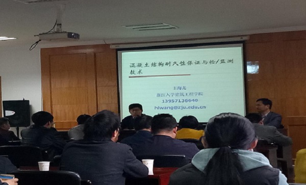 本次講座主要由浙江大學(xué)結(jié)構(gòu)工程研究所王海龍教授主講,他主要圍繞工程結(jié)構(gòu)與耐久性現(xiàn)狀、混凝土結(jié)構(gòu)耐久性影響因素與保證措施、混凝土結(jié)構(gòu)耐久性檢測(cè)與評(píng)價(jià)、混凝土結(jié)構(gòu)耐久性檢測(cè)等內(nèi)容開(kāi)展講解,讓與會(huì)人員深刻了解到了混凝土耐久性的多種保證措施和意義。