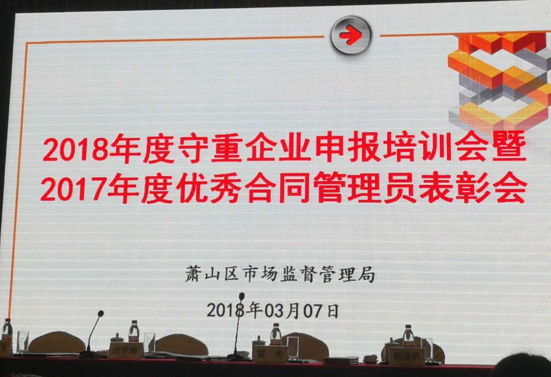 2018年3月7日下午,蕭山區(qū)市場(chǎng)監(jiān)督管理局2018年度守重企業(yè)申報(bào)培訓(xùn)暨2017年度優(yōu)秀合同工管理員表彰會(huì)議在蕭山太虛湖假日酒店召開(kāi),我公司派員參加了會(huì)議。
