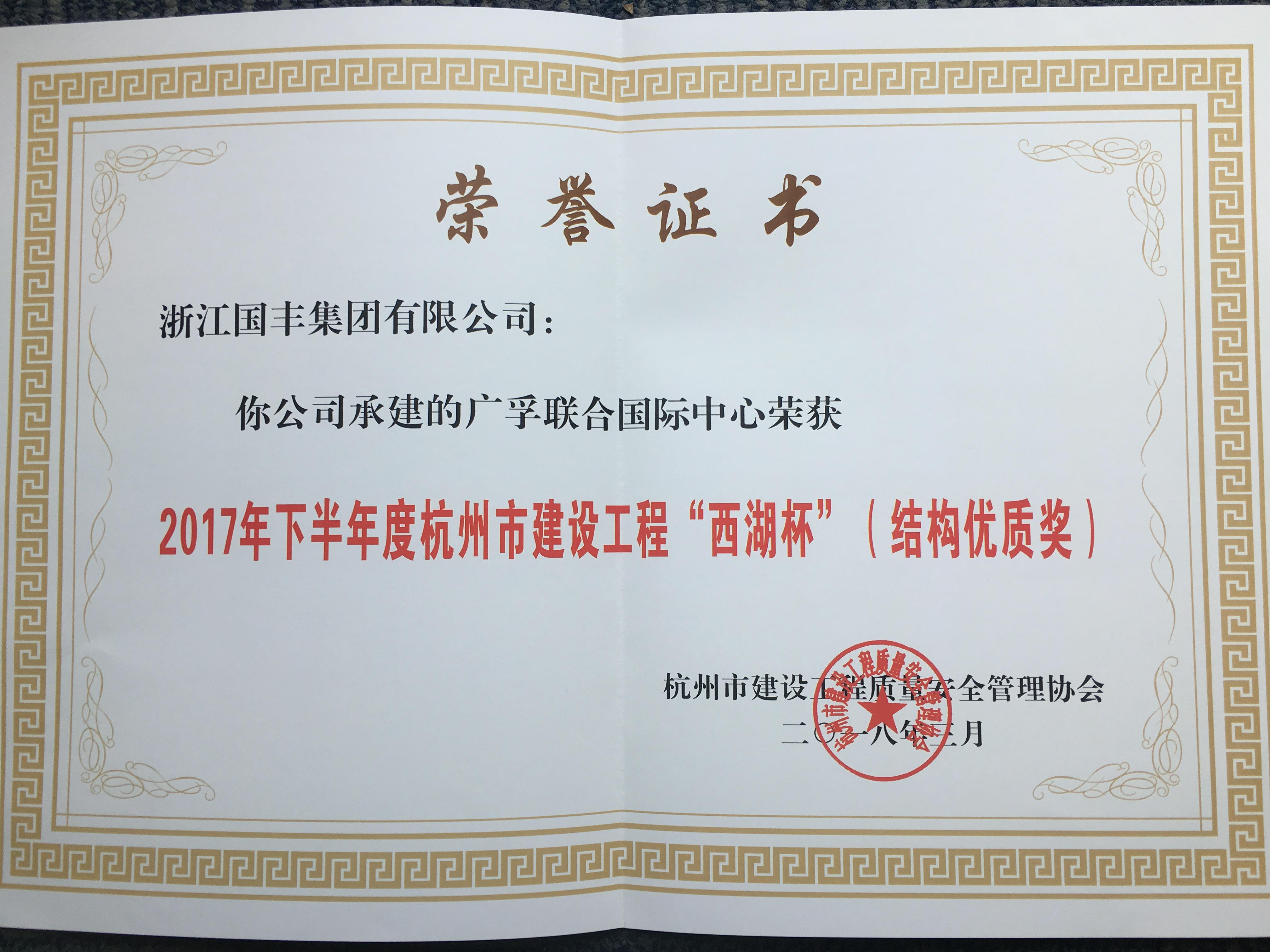 經(jīng)公司申報,專家組現(xiàn)場評審檢查,公司承建的廣孚聯(lián)合國際中心榮獲2017年度下半年度杭州市建設(shè)工程“西湖杯”(結(jié)構(gòu)優(yōu)質(zhì)獎)工程。該工程自2015年1月21日開工建設(shè),地下三層,地上三十六層,框架剪力墻結(jié)構(gòu),總建筑面積91415.56m2,于2017年6月16日主體結(jié)構(gòu)封頂。