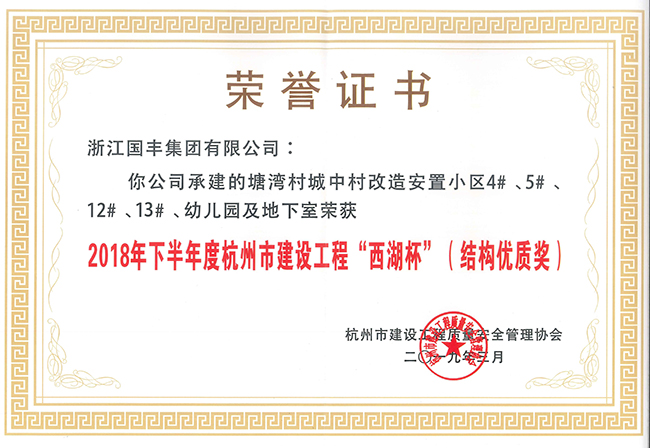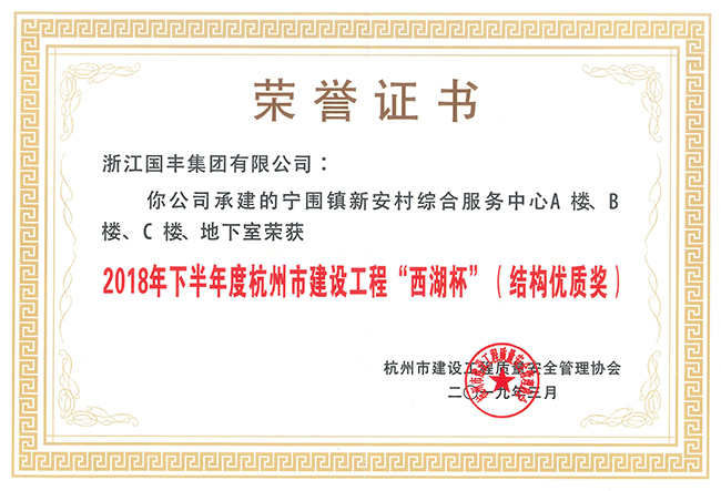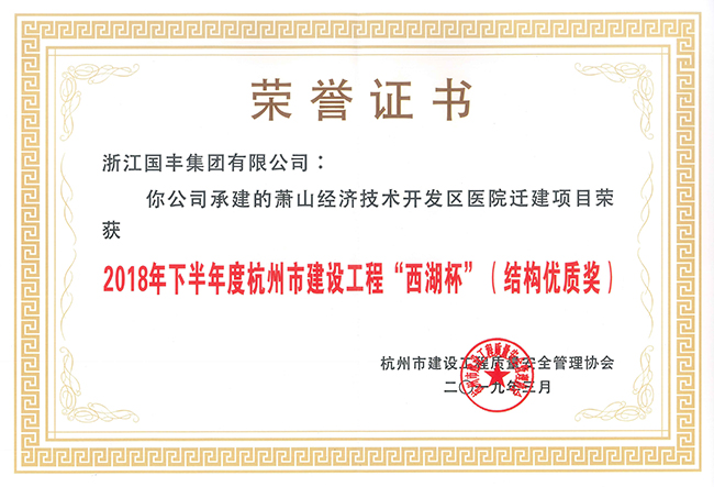 近日,我公司承建的塘灣村城中村改造村改造安置小區(qū)、寧圍鎮(zhèn)新安村綜合服務(wù)中心、蕭山經(jīng)濟(jì)技術(shù)開發(fā)區(qū)醫(yī)院遷建項(xiàng)目等三項(xiàng)工程喜獲2018年下半年度杭州市建設(shè)工程“西湖杯”(結(jié)構(gòu)優(yōu)質(zhì)獎)。