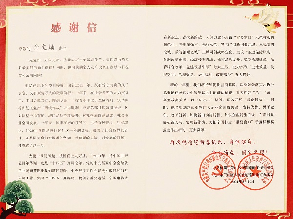 俞文燦董事長對姚書記一行的走訪慰問表示誠摯感謝。他表示,過去一年在街道領(lǐng)導(dǎo)的關(guān)心支持下,我集團(tuán)各項(xiàng)事業(yè)都取得了新的發(fā)展,各項(xiàng)工作得到全面有效的推進(jìn)。新的一年,國豐將進(jìn)一步振奮精神,不懈努力,以昂揚(yáng)的斗志開啟牛年工作的嶄新局面,為寧圍奮力打造“重要窗口”示范樣板模范生作出新的、更大貢獻(xiàn)。